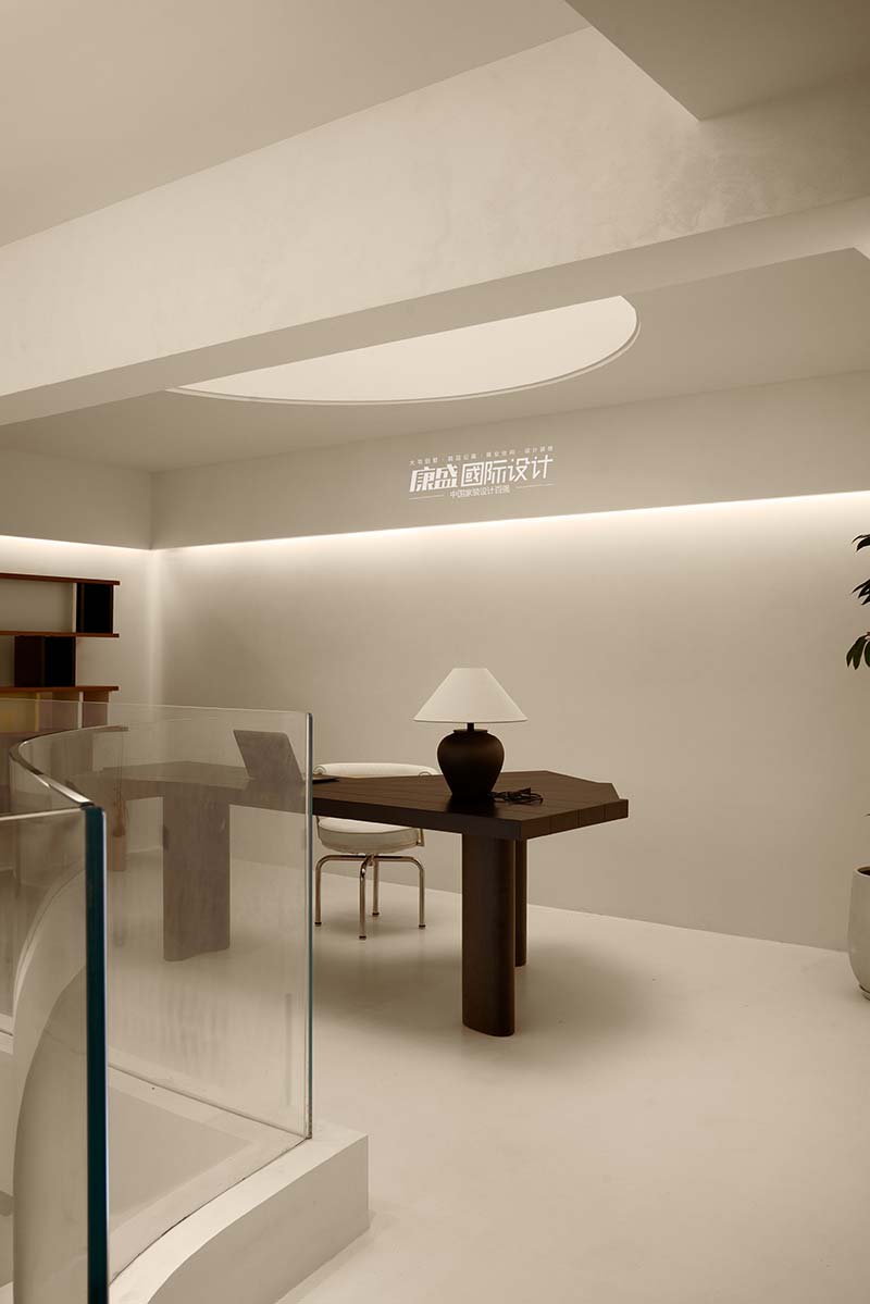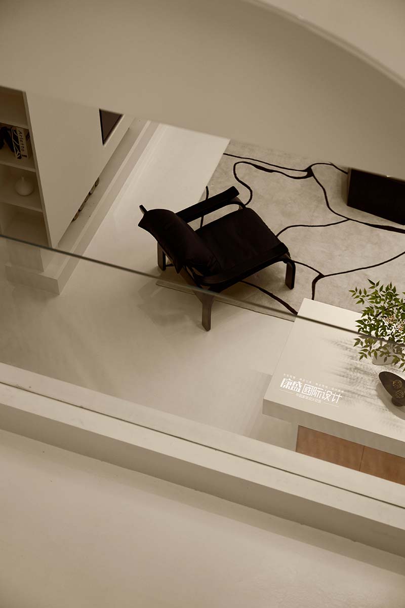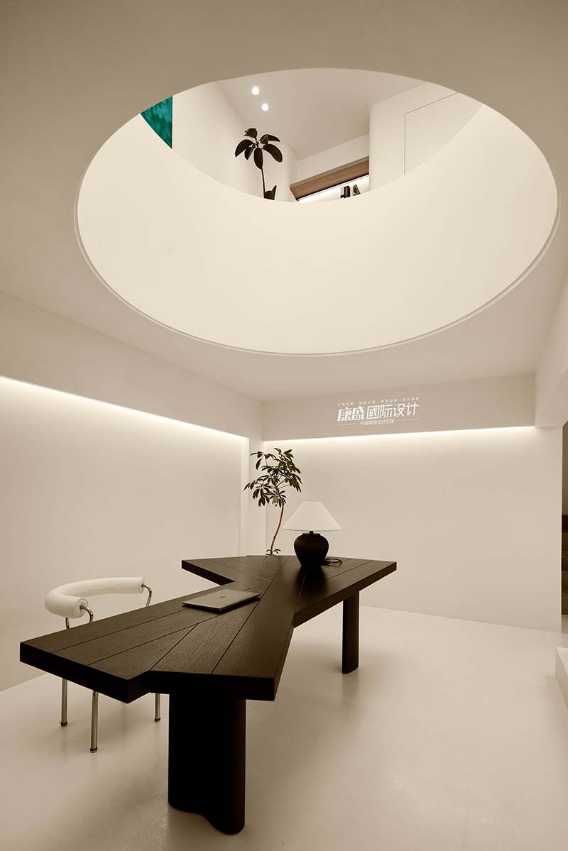 The top surface of the first floor is an irregular roof, on which a light film design was made to complement the circular hole. Looking up from the basement mezzanine, there will be a visual extension effect.