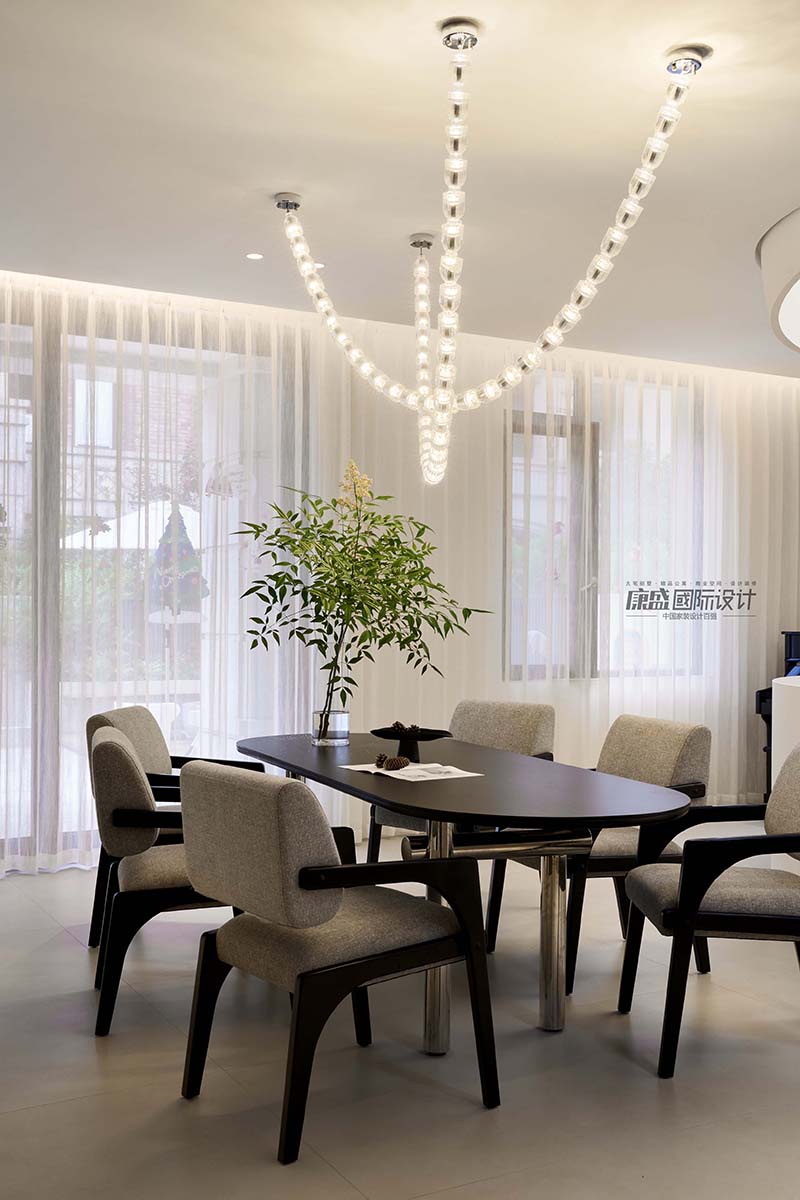 在大面積墻面和天花板上使用奶油白色調(diào),使空間顯得格外明亮開闊;地面選擇了淺色系的地磚,使空間更加和諧統(tǒng)一。餐廳的精致鏈條吊燈,帶給人一種強烈的視覺沖擊力;同時也散發(fā)出了柔和光,帶給人溫暖的舒適感。