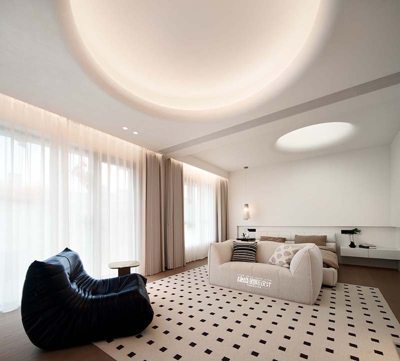 一樓的頂面是異形頂,在這個基礎上做了燈膜的設計,跟圓洞起了一個相互呼應的作用。從地下室的夾層往上看就會有視覺延伸的效果。