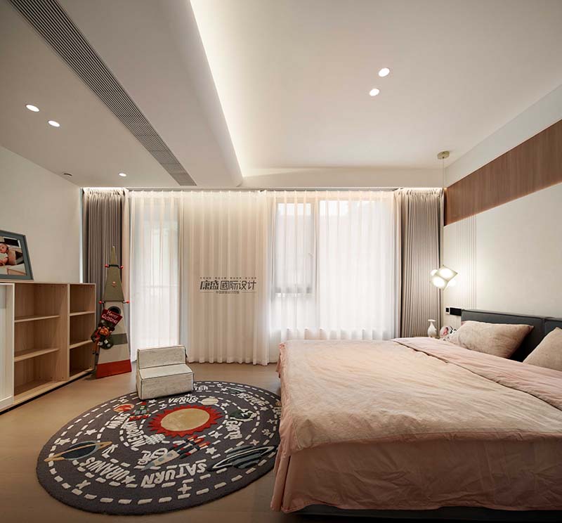 The children's room adopts soft color tones to create a warm atmosphere, while also adding some bright colors such as pink blankets and sapphire blue table fishing lights to make the space more lively and lovely. The decoration of wooden furniture is perfectly integrated with the entire space, and the texture and texture of natural wood emit a natural life atmosphere, creating a comfortable and healing growth space.