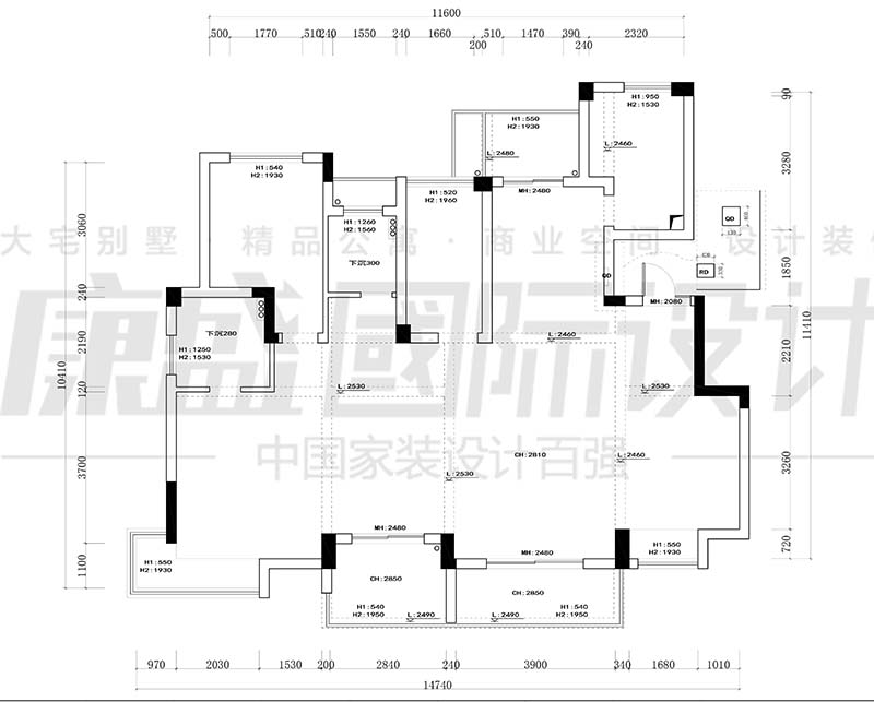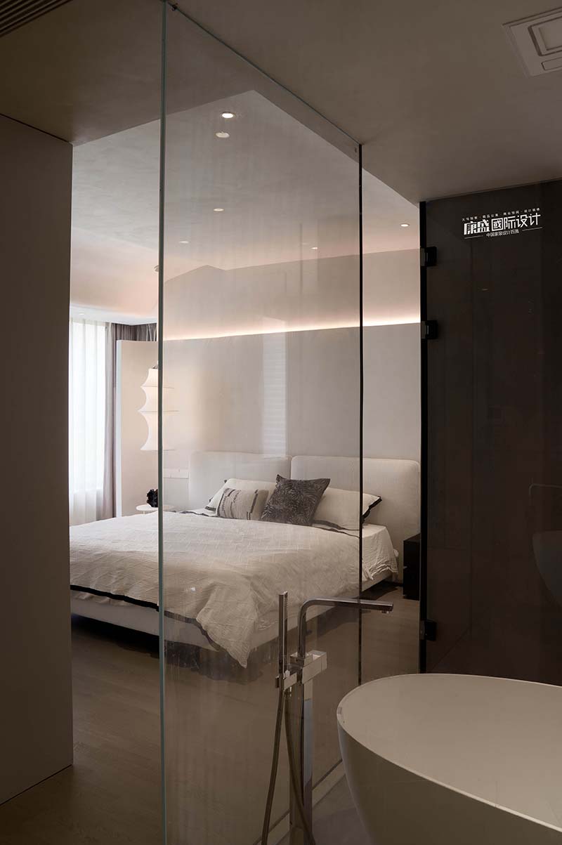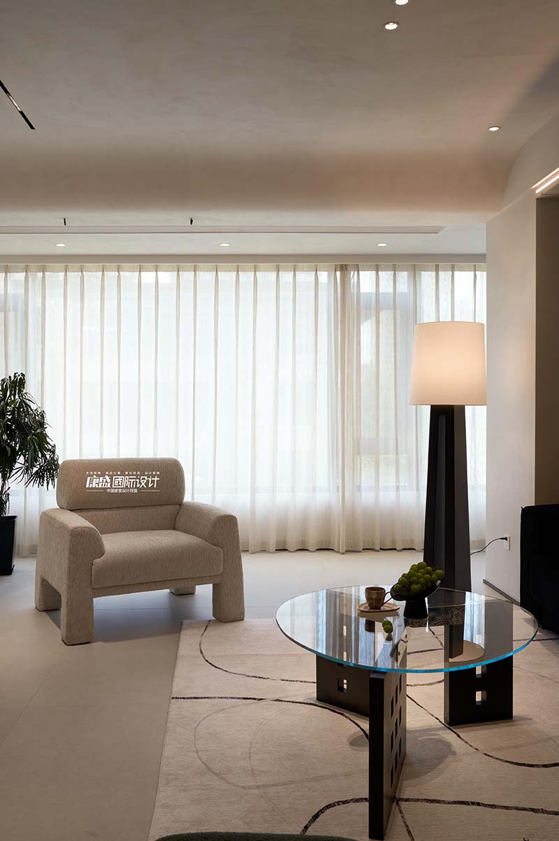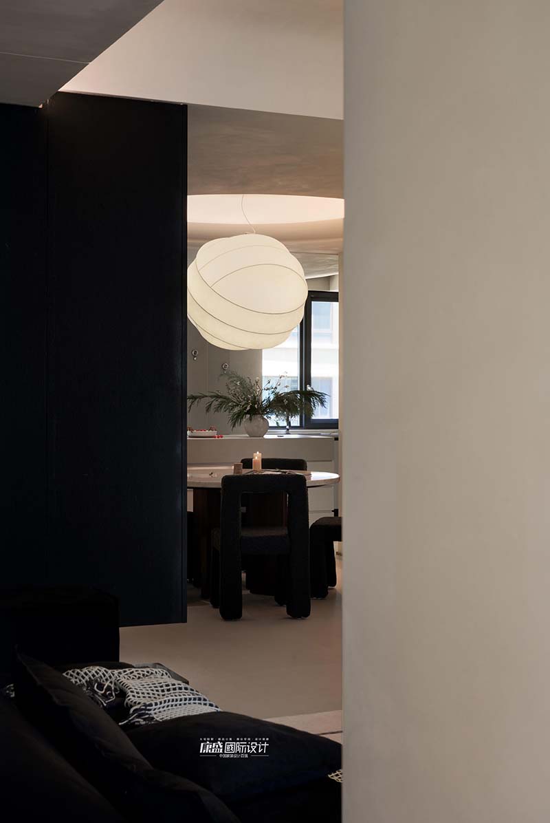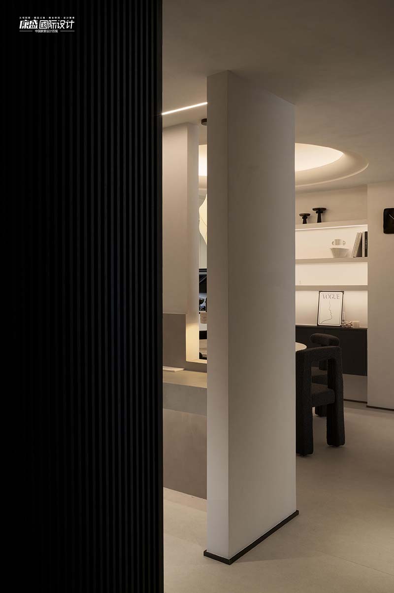 頂部采用流暢的線條設計,走道作為中軸線,擴展了整個視覺效果。整體布局視野開闊,保持了空間的開放感,各個區(qū)域有序分布,營造出一個既純粹又高雅的生活環(huán)境。