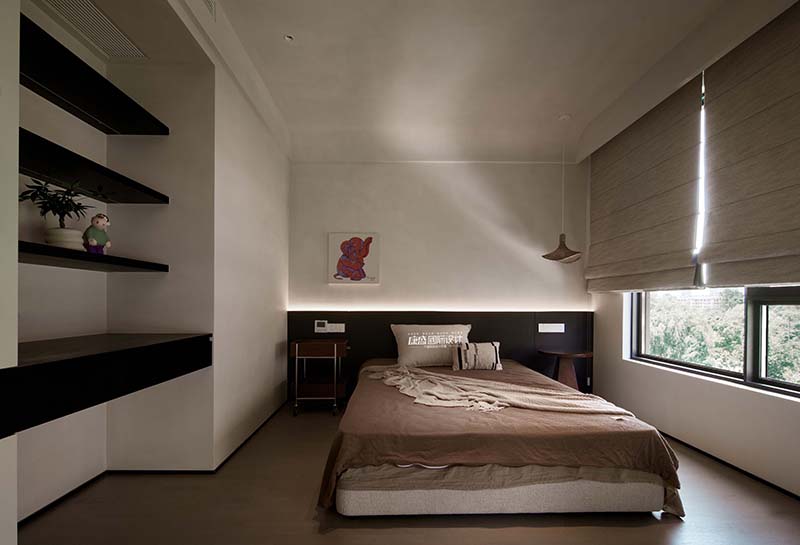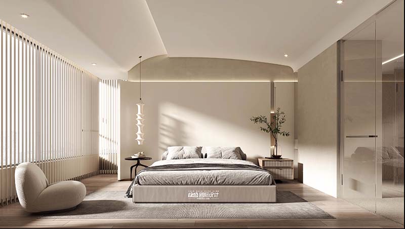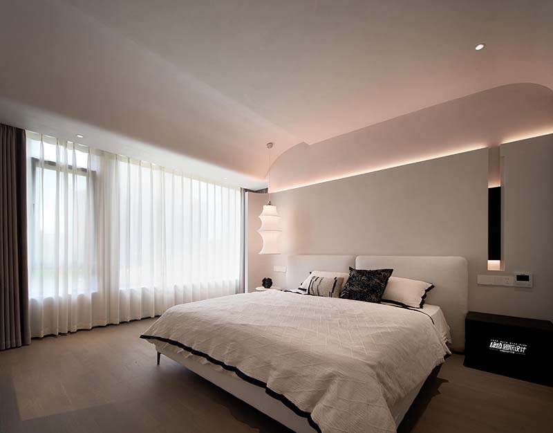 A spacious and comfortable bed is located in the center of the bedroom, with low saturation color bedding that complements the overall color scheme. Embedded light strip+pendant light, multiple light sources complement each other.