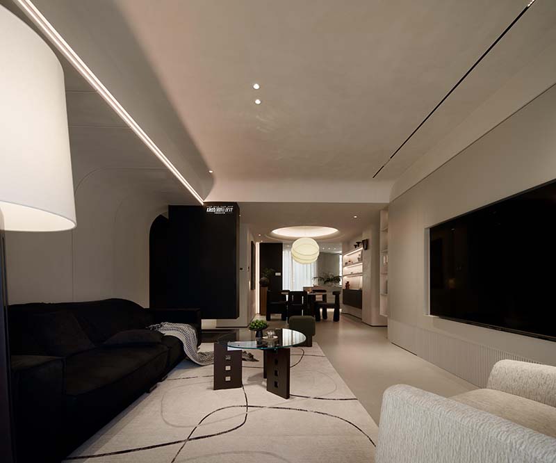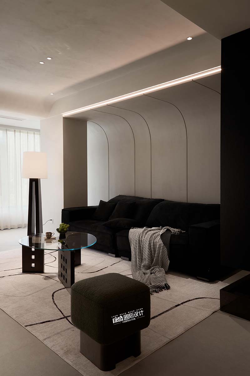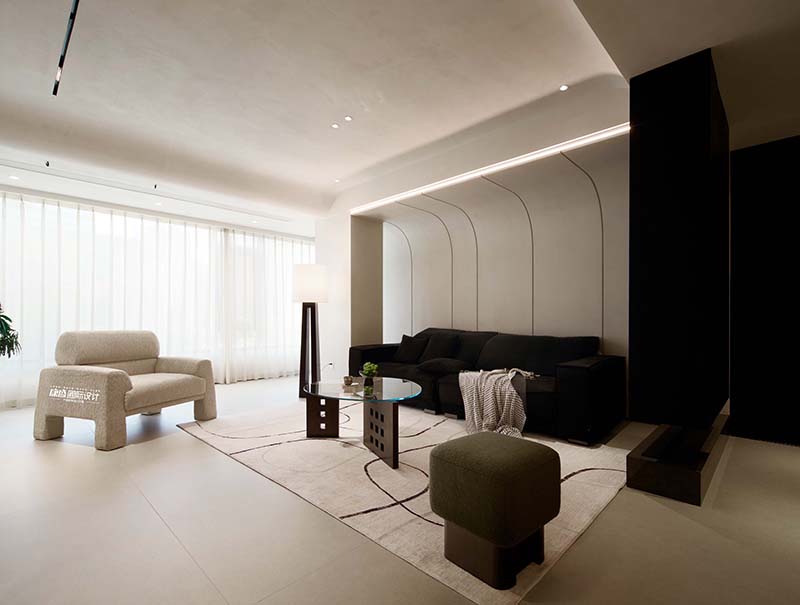 客廳的主色調(diào)為柔和的奶油白,搭配黑色的長沙發(fā)和墨綠色的椅子,形成了鮮明的色彩對比,墻面設計為不同的弧形木飾面,營造出獨特的居住氛圍。