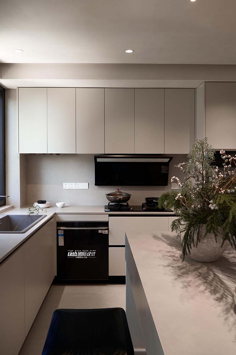 U型廚房+島臺,櫥柜都是設計成隱藏式的,增加廚房操作臺面的同時也增加了收納的空間。
