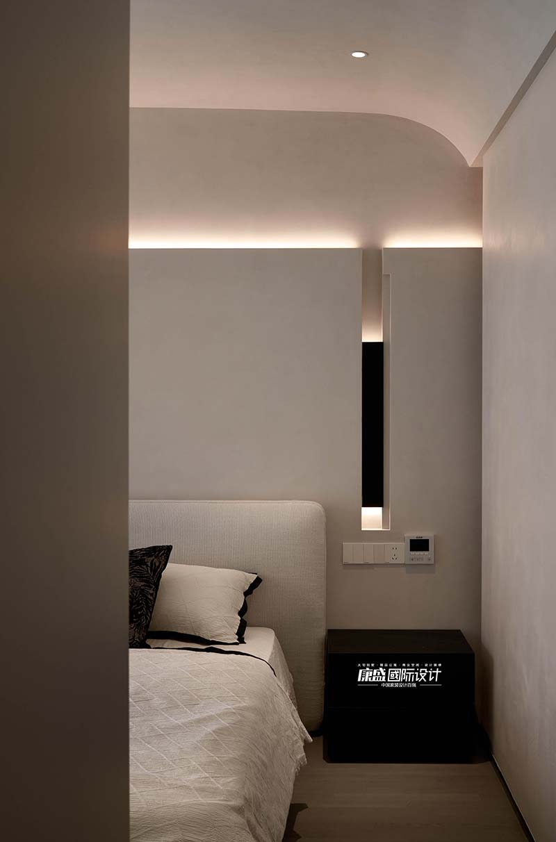 一張寬大舒適的床位于臥室中央,低飽和度色系的床品與整體色調(diào)相得映彰。內(nèi)嵌式燈帶+吊燈,多種光源相互呼應。