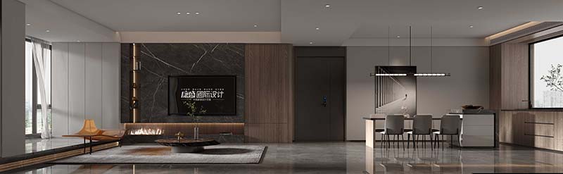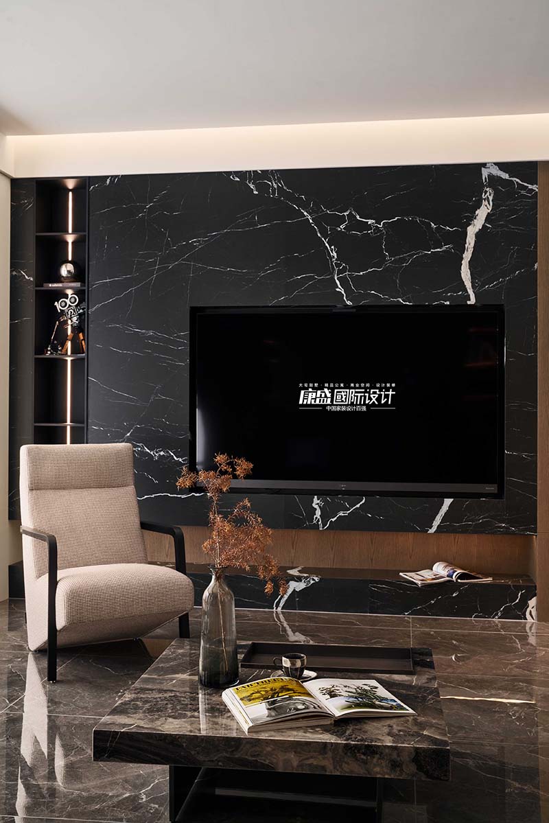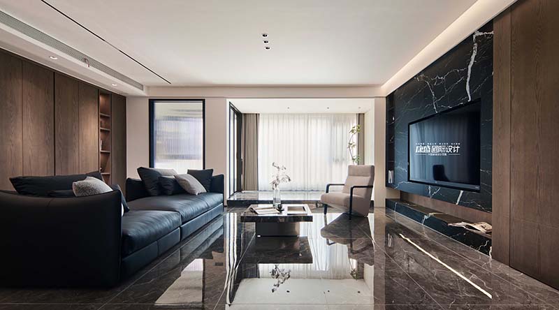 The main color scheme of the living room adopts coffee and black, using simple yet powerful lines and geometric shapes as design elements. The walls, cabinets, and floors are covered in large areas of coffee and black, creating the overall tone of the space. White was chosen for the ceiling and walls to enhance the brightness of the space.