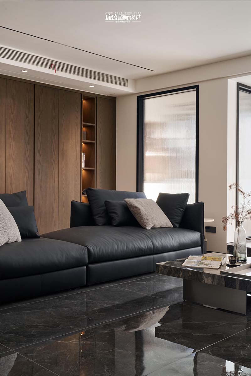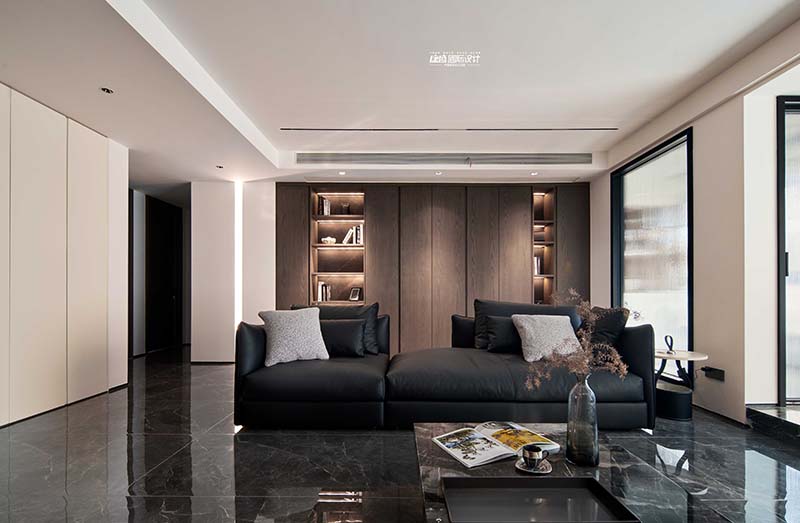 The living room sofa is no longer traditionally placed against the wall, but is chosen to be left empty for storage at the back. A full top cabinet storage is created against the wall, and open compartments are integrated on both sides to create rich layers. Paired with embedded light strips, it looks high-end and distinguished.