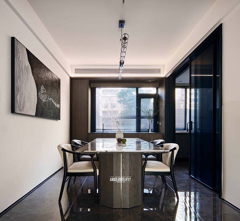 A simple and atmospheric white patterned rock dining table, low saturation color leather dining chairs, paired with a black minimalist straight pendant light, with smooth lines, creates a strong dining atmosphere.