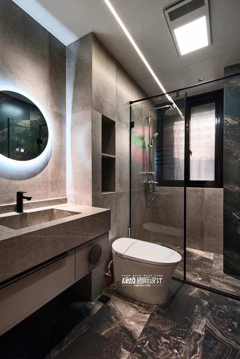 The main color scheme is dark, with dark gray marble paired with coffee colored wooden storage cabinets. In the interplay of light, a space atmosphere full of luxury is created, showcasing elegance and taste. Simple three separation design, separating dry and wet water vapor, especially suitable for the decoration design needs of rainy southern areas.