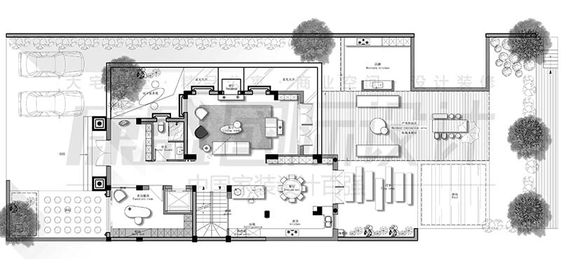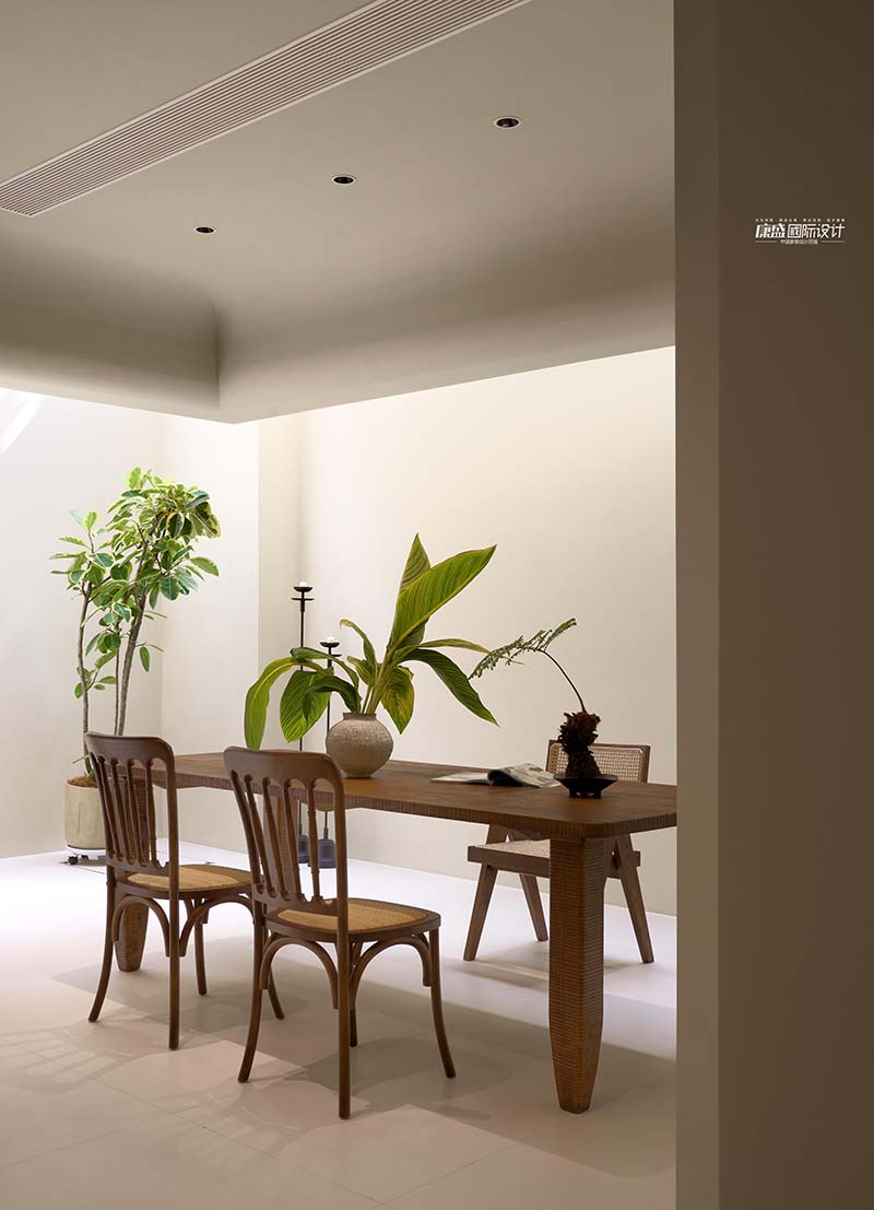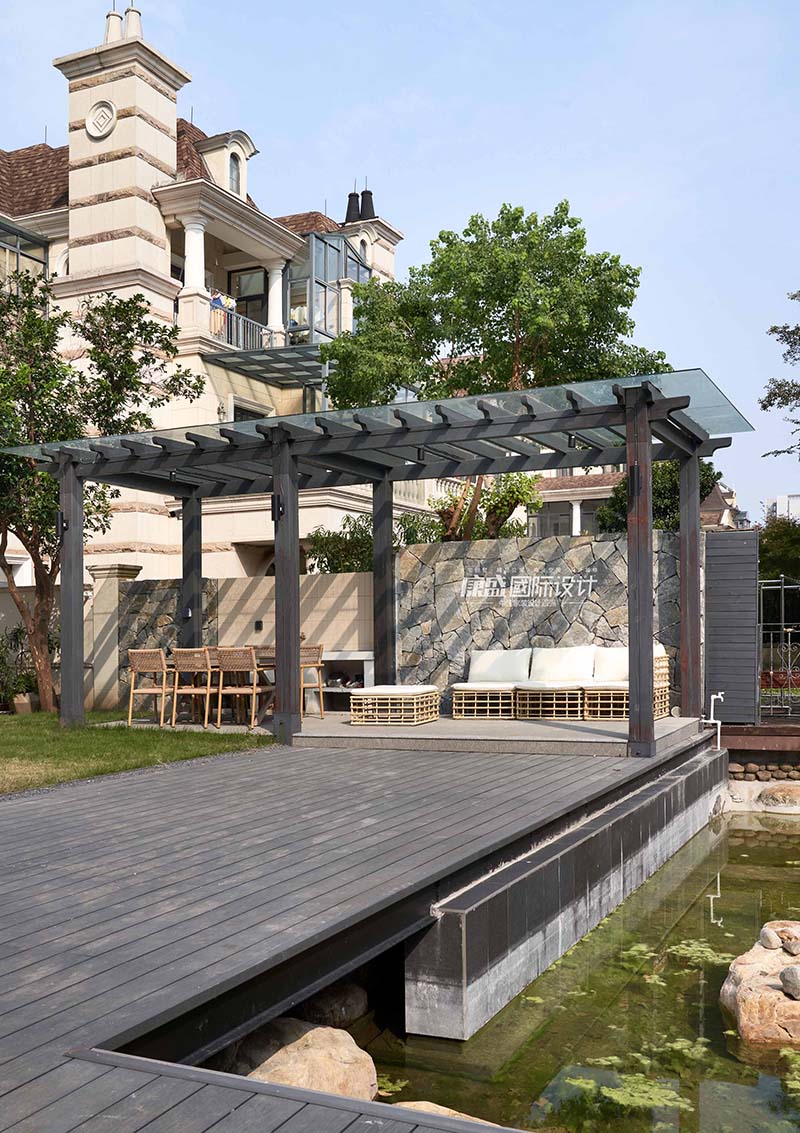 The yard is made of antiseptic wood flooring as a backing board, and the platform is divided by a trail, and various green plants, flowers and ponds are arranged on both sides of the platform, and the addition of natural elements of animals and plants not only beautifies the space, but also brings vitality and vitality to the courtyard. The relaxation area is equipped with comfortable wooden dining tables and chairs, and it is very comfortable to make tea around the stove and feel the natural landscape.
