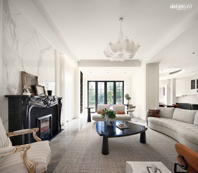 The living room features a perforated stone fireplace in the location of the original TV wall to create a French style atmosphere. On the one hand, the living room retains the core color matching and material selection of French style, while on the other hand, it abandons the overly complicated and grand design of classical French, and instead uses simple lines and gypsum lines to create the overall spatial style.
