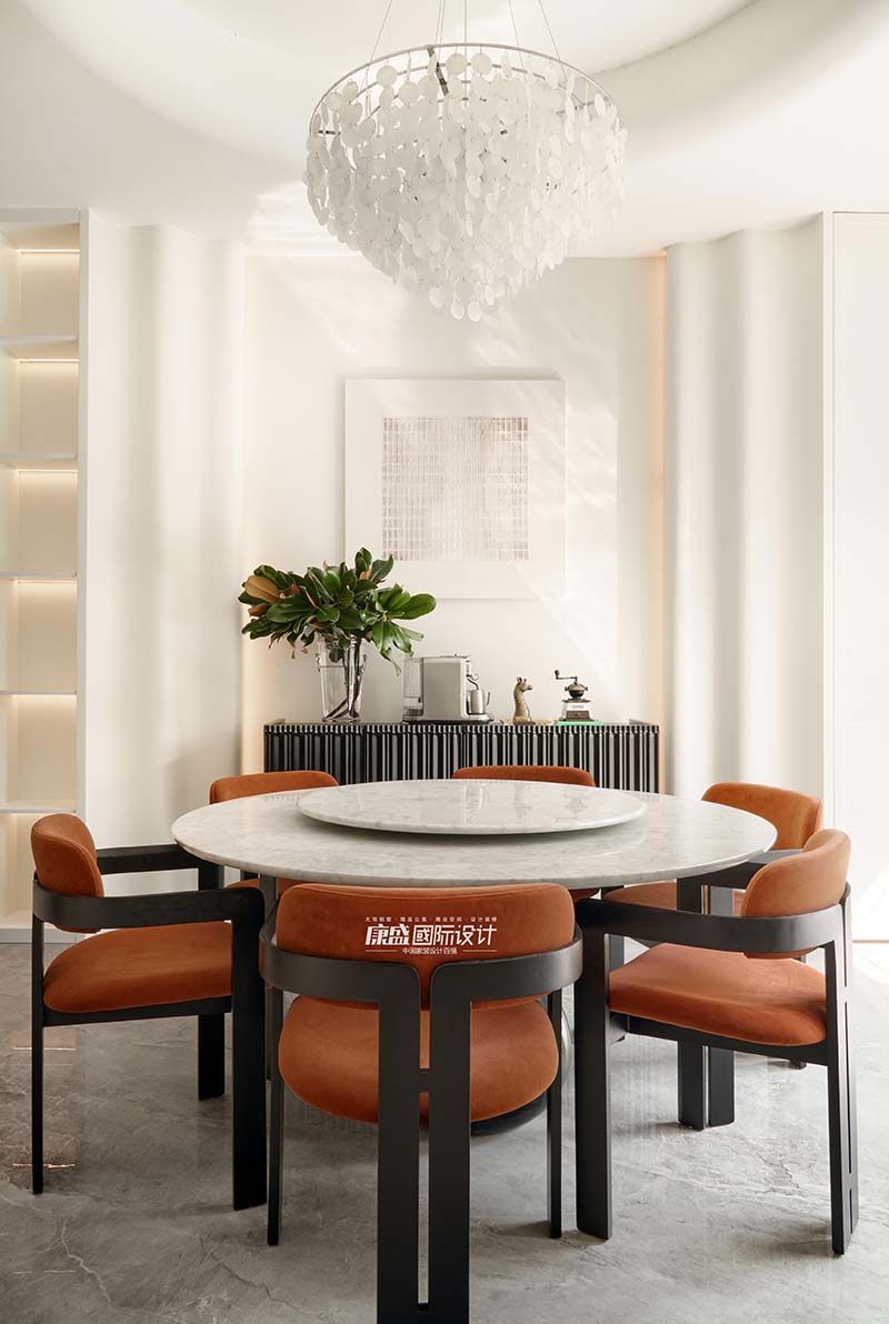 餐廳 餐廳的圓形吊頂與圓形餐桌相呼應(yīng),弧形吊頂使空間優(yōu)美流暢,也讓吊燈有足夠高度;精致的貝殼吊燈豐富了空間的元素,讓餐廳盡顯浪漫的同時(shí)不失高級(jí)感。