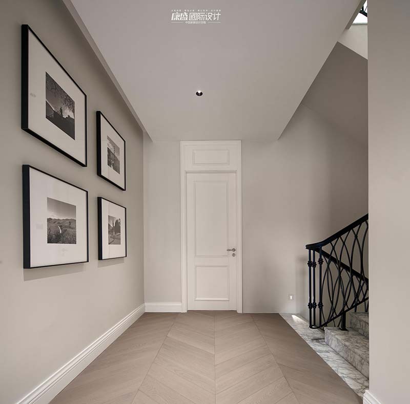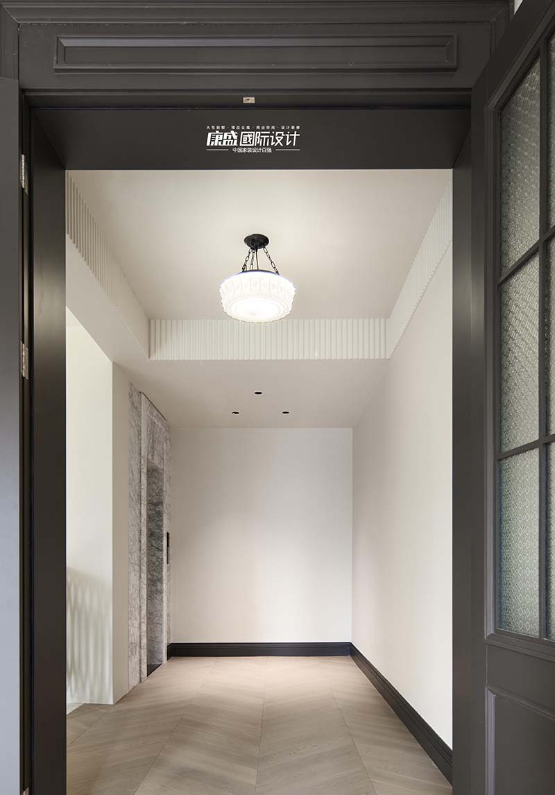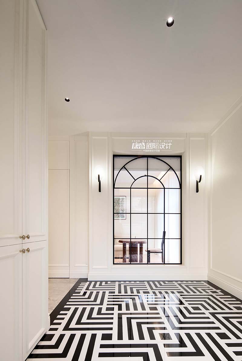 On the side of the entrance leading to the multi-purpose room, there are storage cabinets for easy storage, and the black decorative wrought iron windows echo the black and white paperwork paper paper floor tiles, with the French lines on the wall, making the space more concise and soothing.