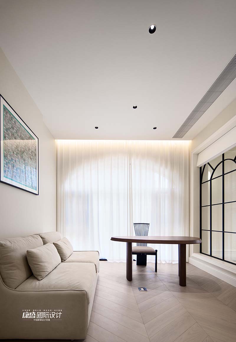 會(huì)客區(qū) 進(jìn)入地下室時(shí)第一眼,就會(huì)被入口處的連環(huán)拱形吸引。在入口處打造了三扇連環(huán)拱門門洞,既形成了強(qiáng)烈的秩序感,又增加了空間的趣味性。地下室整體采用了溫柔的奶油白色調(diào),低飽和度的色系,干凈溫柔,會(huì)客區(qū)吊頂融入了圓弧形的水波紋設(shè)計(jì),讓每一次的抬頭,都仿佛置身浪漫的海洋,在弧形四周還內(nèi)嵌燈帶,通透感十足。