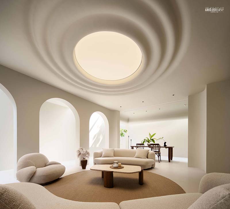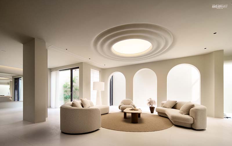 The water ripple ceiling at the ceiling and the arch design are undoubtedly "embedded" in the simple space. The rounded sofa is placed in an enclosed manner, which not only echoes the circular ceiling shape of the recessed ceiling, but also becomes an independent space in the open space. There is interaction between scenes, but they remain independent of each other. There are no boundaries between the spaces, and the areas are distinct, forming different worlds and regions, forming a unique field of space .