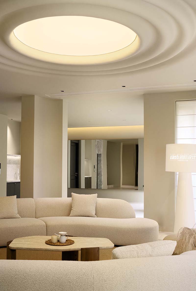 天花板處的水波紋吊頂以及拱門設(shè)計(jì),無(wú)疑是在簡(jiǎn)約的空間中“嵌入”了法式浪漫。圓弧形沙發(fā)圍合式放置,既與頂部凹進(jìn)去的圓形吊頂造型相呼應(yīng),又在開(kāi)放式空間中成為獨(dú)立的一個(gè)空間。場(chǎng)景與場(chǎng)景之間有交互,又保持相互獨(dú)立。各空間之間不設(shè)界限,區(qū)域分明,自成不同天地,形成空間獨(dú)特的場(chǎng)域。