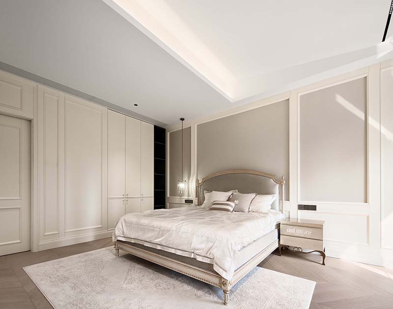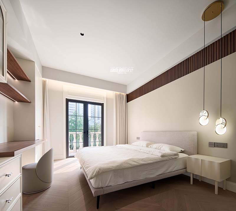 The color scheme of the bedroom space is based on a large area of cream white, and the floor is covered with warm and comfortable fishbone parquet flooring, with low-saturation color bedding, which is warm and comfortable and maintains the overall tonality.