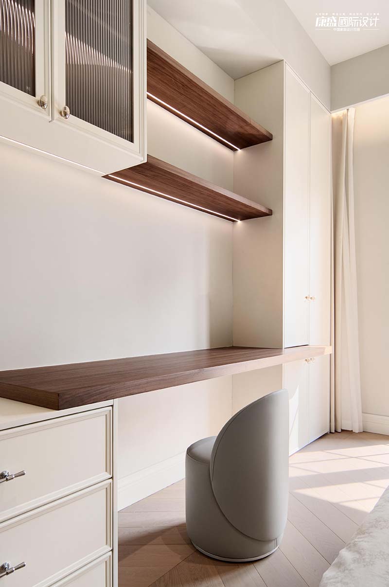 The low-saturation cream color creates an understated and gentle atmosphere, while the plaster moulding on the walls incorporates the sophistication and romance of French life. The combination of walnut windows and transparent glass brings better lighting to the interior, making the space brighter and more transparent, adding a touch of luxury to the layered sense of space.
