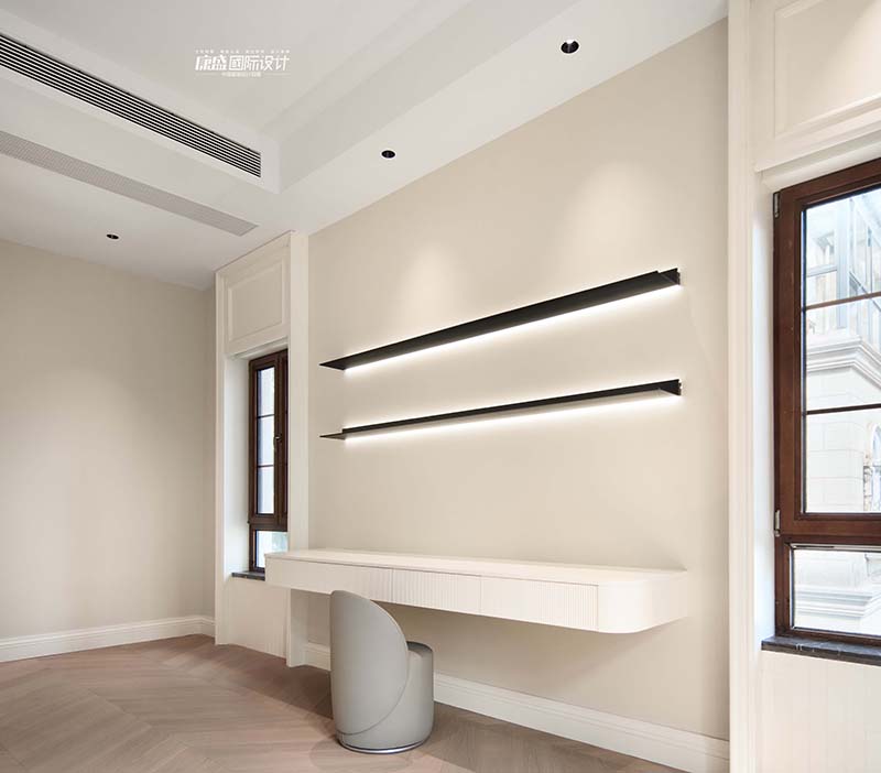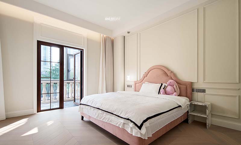 次臥 低飽和度奶油色營(yíng)造了一股低調(diào)溫柔的氛圍,同時(shí)墻壁上打造石膏線條裝飾,將法式生活的精致和浪漫融入進(jìn)去。胡桃木窗與通透的玻璃相結(jié)合,為室內(nèi)帶來(lái)更好的采光效果,使空間更加明亮和通透,為層次分明的空間感添一抹高級(jí)。