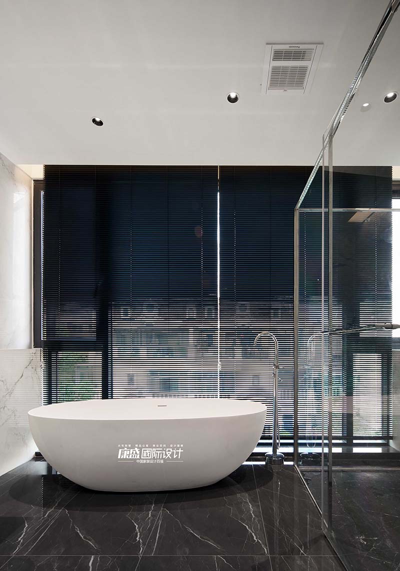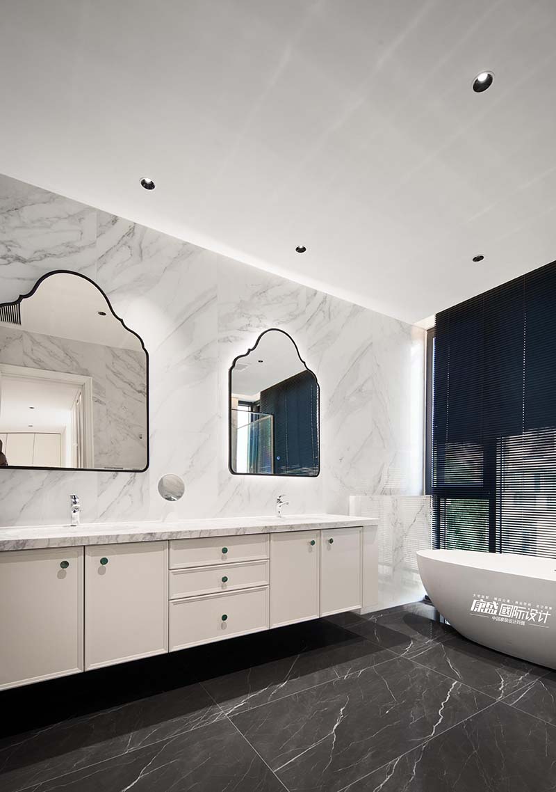 衛(wèi)生間 獨(dú)立式浴缸的設(shè)計(jì)簡(jiǎn)潔大方,與黑色地面相得益彰,兩個(gè)洗手池的鏡子形狀各異,獨(dú)具匠心。浴缸旁的大窗戶引入自然光線,搭配黑色的百葉簾讓屬于自己的私人時(shí)光,寧?kù)o而有安全感。