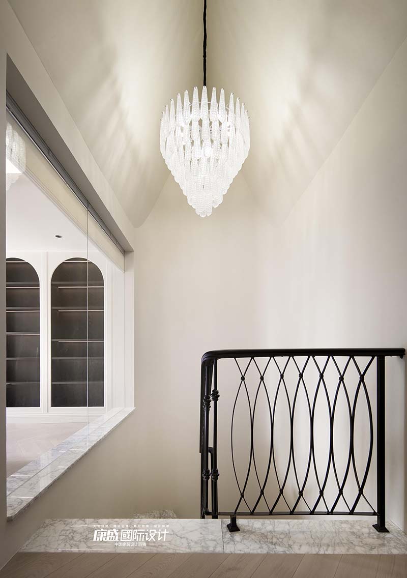 The pointed shaped ceiling and crystal lamps echo the entire wrought-iron handrail of the staircase. A whole wall of French bookcases, the top of the arched design with visible glass doors, transparent and high-end. Each partition is equipped with a built-in light strip, which can be used as a lighting function and add a sense of atmosphere.