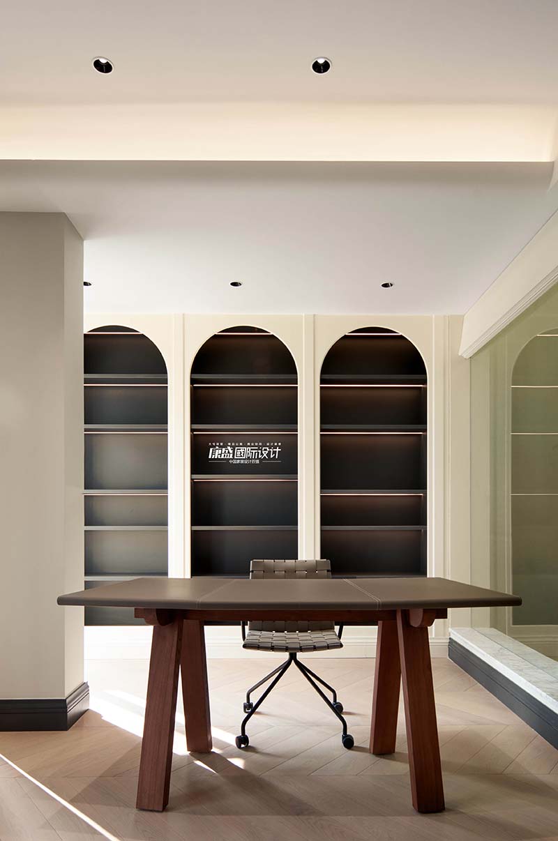 書(shū)房 尖形的異形頂搭配水晶燈呼應(yīng)樓梯廳的整個(gè)鐵藝扶手。 一整面墻的法式書(shū)柜,頂部做了拱形造型設(shè)計(jì)搭配可視玻璃門,通透又高級(jí)。每層隔板都搭配了內(nèi)嵌式燈帶,既可以作為照明的作用,又增加了氛圍感。
