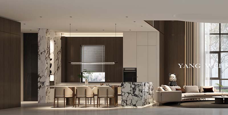 The kitchen area on the ground floor has an open plan layout with a clean yet functional design. The built-in dining room is seamlessly connected to the island table, improving space utilization and family interaction. The kitchen is mainly made of dark wood and metal, which is full of modernity, and you can enjoy the beauty of the design while savoring the food.