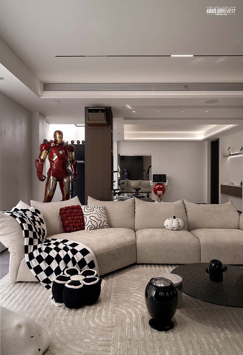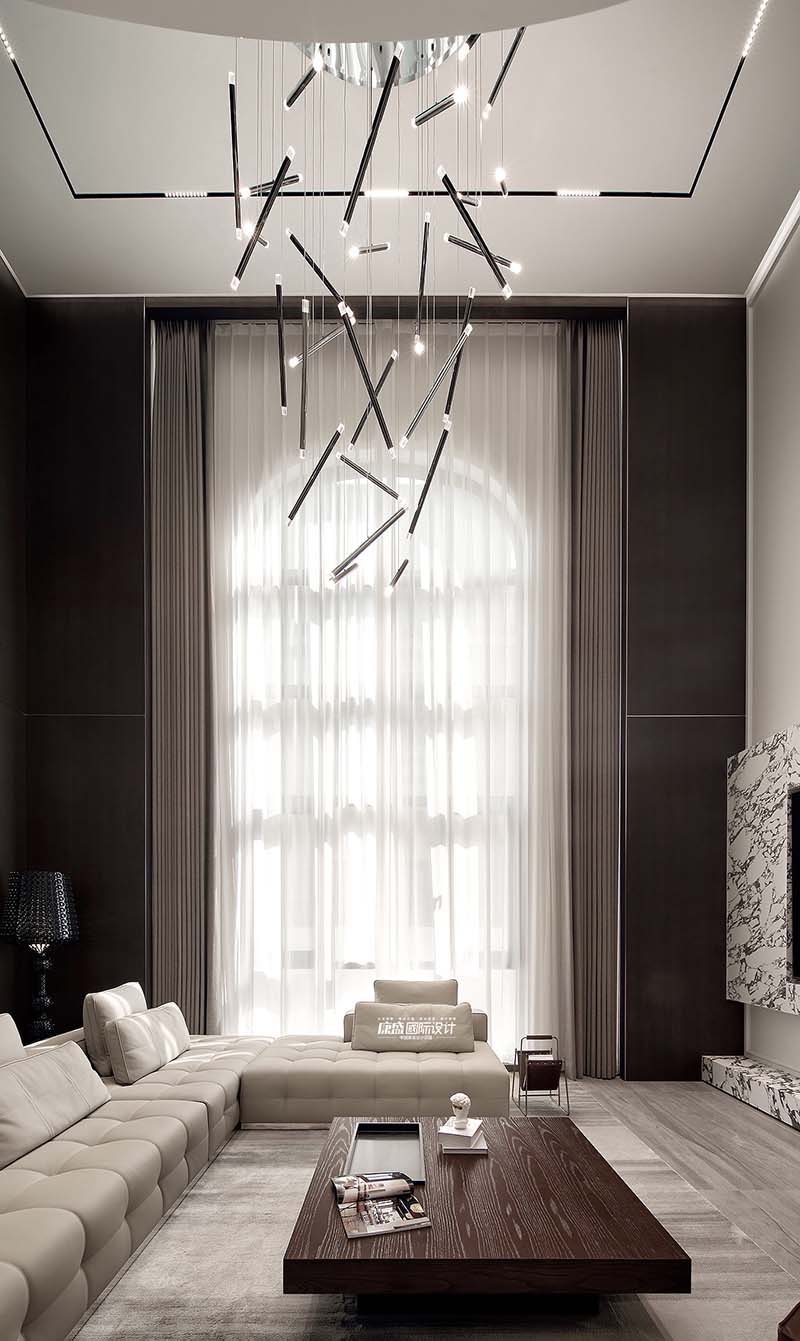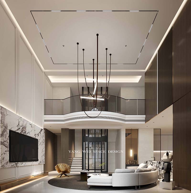 Overhead, a custom crystal chandelier hangs in the center of the sky, like the Milky Way falling into the world. Whether it's the sun shining during the day or the lights shining at night, this chandelier adds a touch of artistic touch to the living room space. From the second floor, you can see the entire living room. The design of the void makes the space more grandiose, and the careful placement of furniture outlines the clarity and beauty of the functional area. Whether it's a family get-together or a meeting with guests, it's the perfect place to be.