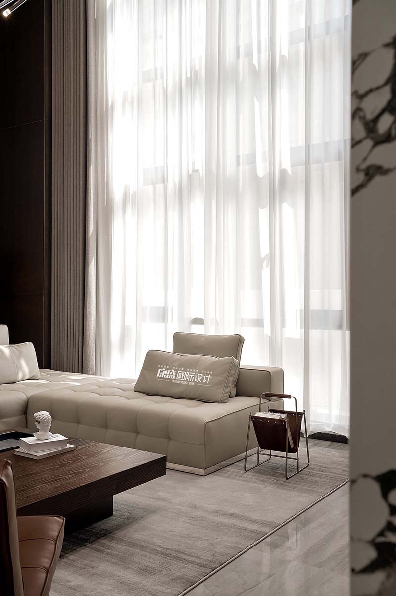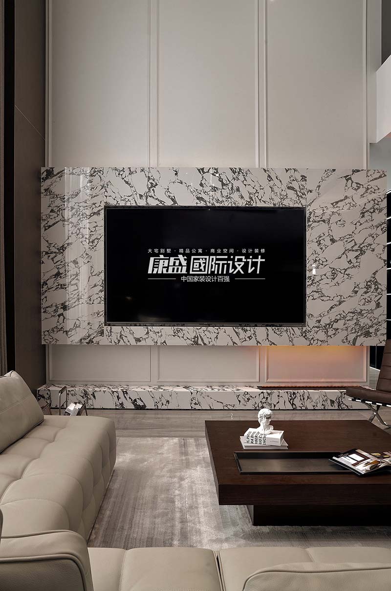 On the front is a marble TV backdrop, whose natural texture is smooth and full of tension, showing a low-key luxury texture in simplicity. The design lines of the wall are integrated with the whole space, making the living room a dual focus of vision and function. Floor-to-ceiling windows bring the natural beauty of the outdoors indoors. During the day, there is plenty of light, and the greenery and blue sky reflect a bright and open landscape; At night, the lights outside the window complement the interior lighting, creating a peaceful and welcoming atmosphere.