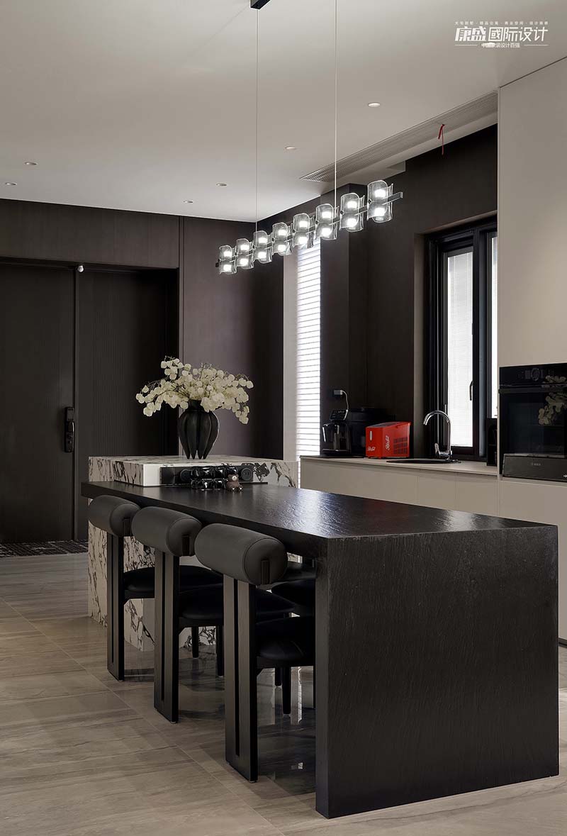餐廳 一樓餐廚區(qū)域采用開放式布局,設(shè)計簡潔而功能強大。內(nèi)嵌式餐廳與島臺餐桌無縫連接,提升空間利用率的同時也便于家人互動。廚房以深色木質(zhì)與金屬質(zhì)感為主,現(xiàn)代感十足,在品味美食的同時更享設(shè)計的美感。