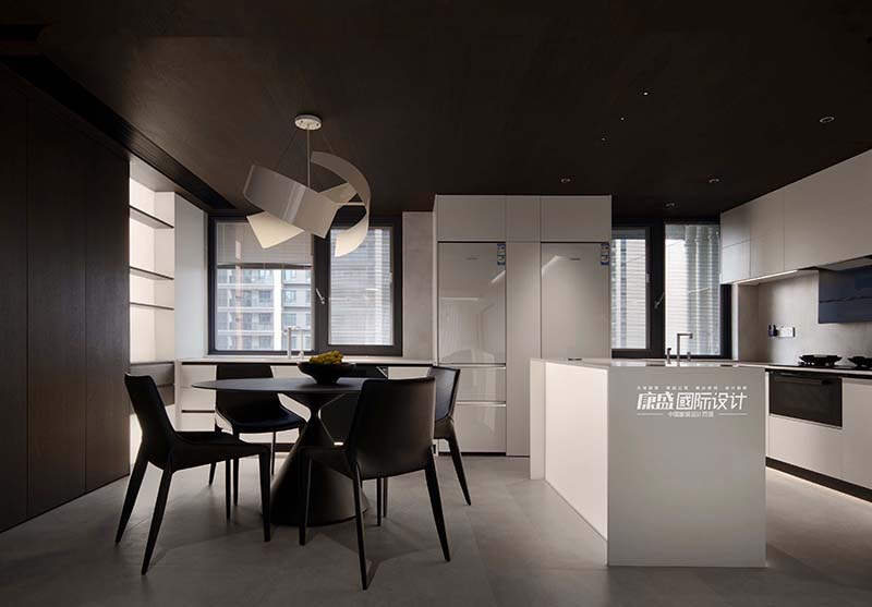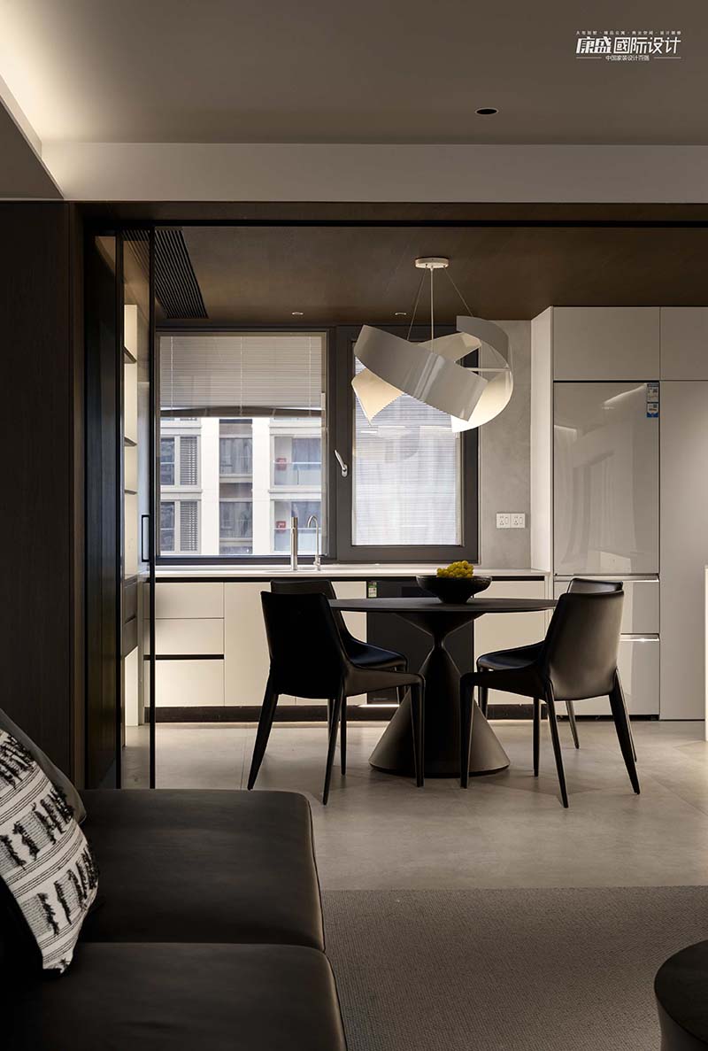 The seamless integration of the dining room and the kitchen is a perfect interpretation of the minimalism in life. The U-shaped kitchen design gives more possibilities to the space, and every countertop and every piece of kitchenware has been perfectly laid out, making cooking and life easier and more efficient.